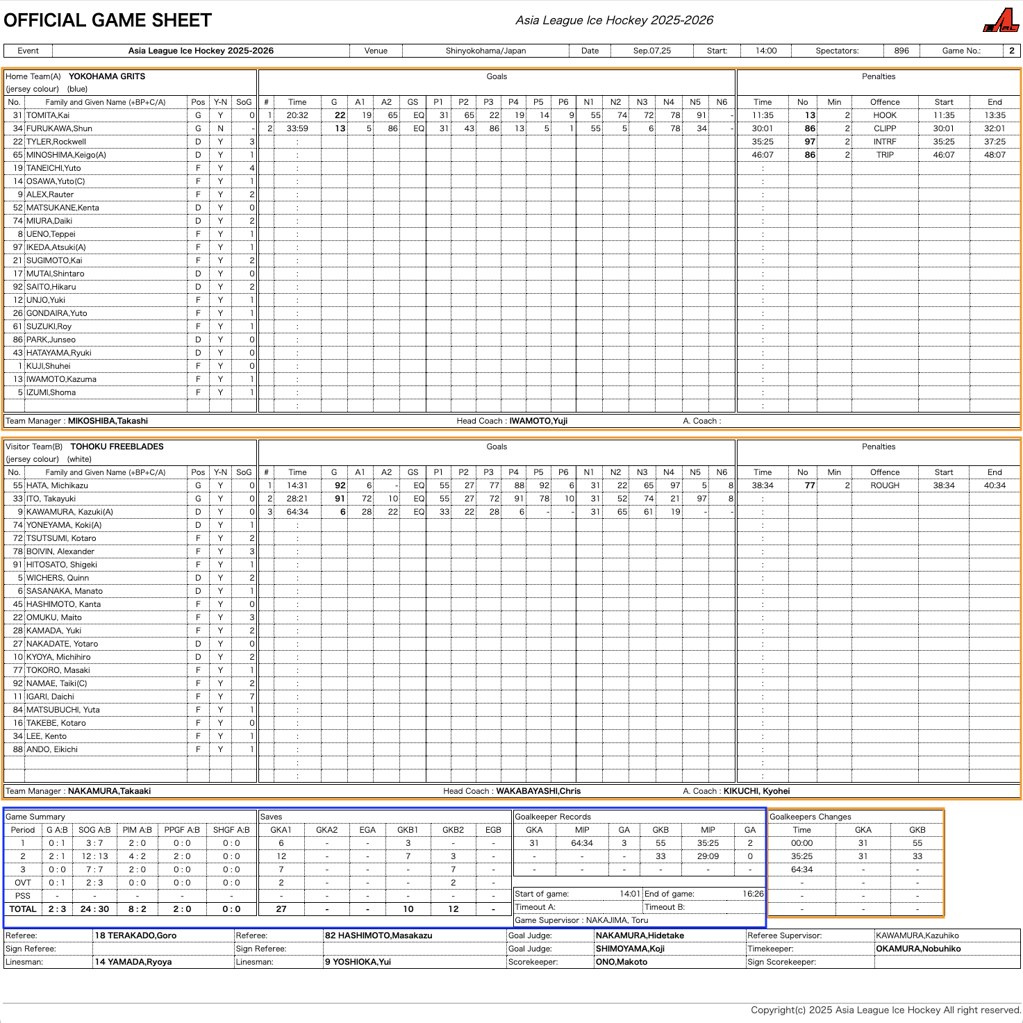 スコアーの入力は会場でExcelを使い入力しています。そのスコアー入力用のExcelシートはお見せできませんが、OFFICIAL GAME SHEETとほぼ同じように作られています。スコアーは以下の画像の、オレンジ色の部分が試合会場で入力する部分で、青色の部分はシステムが集計した結果です。