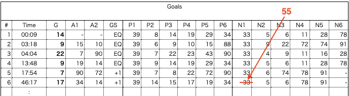 ゴールの記録には、ゴール時にスケートリンクにいた選手の背番号が記録されています。P1〜P6は攻撃チーム、N1〜N6は防御チームの選手です。アイスホッケーは通常は1チーム6人(ベンチには最大23人まで入ります)がスケートリンクにいるのですが、反則等で5人になっている場合があります。このゴールではNは5人しかいなかったので、苦し紛れにNo.55を2ヶ所に記入したと思われます。本来はN6は-