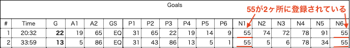 このような記入があると集計ソフトはキーパーのNo.55が2ヶ所あったので2回集計してしまったようです、現在のコードはこのようなケースに対応していませんでした。N6を-