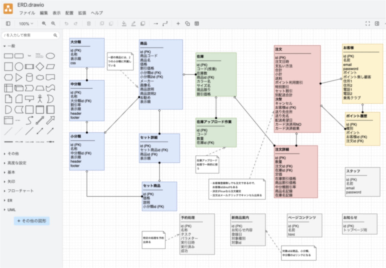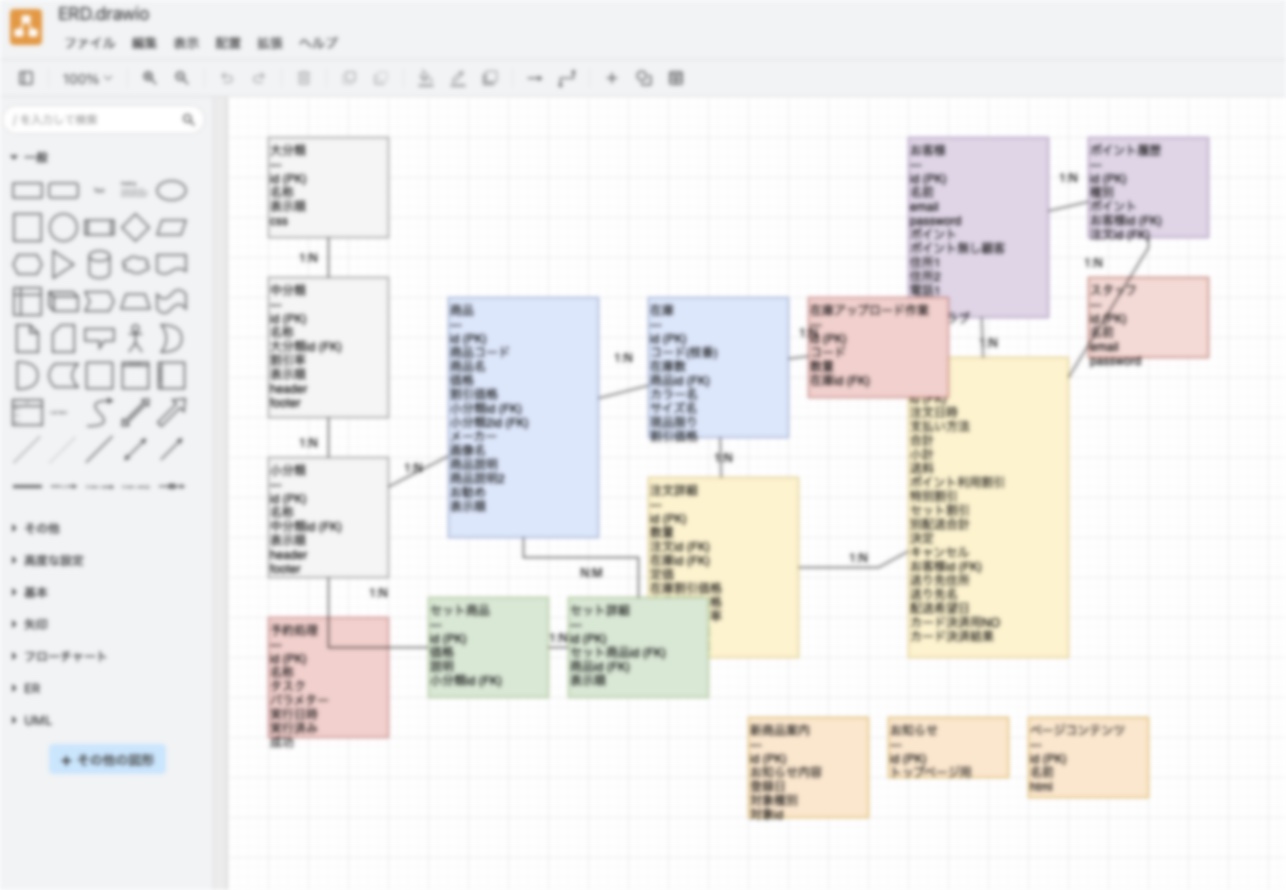 - 15個の主要エンティティ(大分類、中分類、小分類、商品、在庫、お客様、注文、注文詳細 ・・・