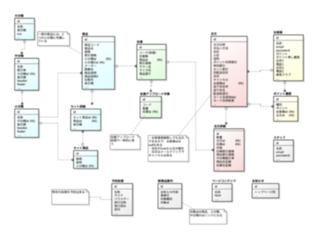 以下の画像はUMLツールasthで作成したER図のPDFから作った画像です(現在も動いているシステムなのでぼかしが入っています)。