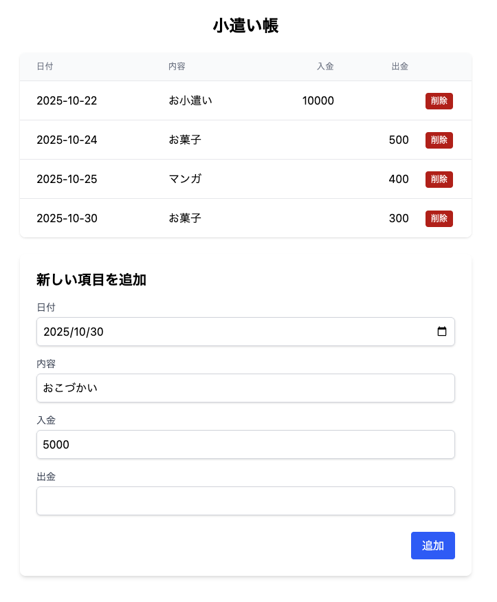 以前Pythonで使った小遣い帳アプリと同じようなアプリを作る事にしました。