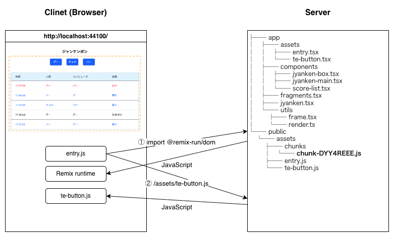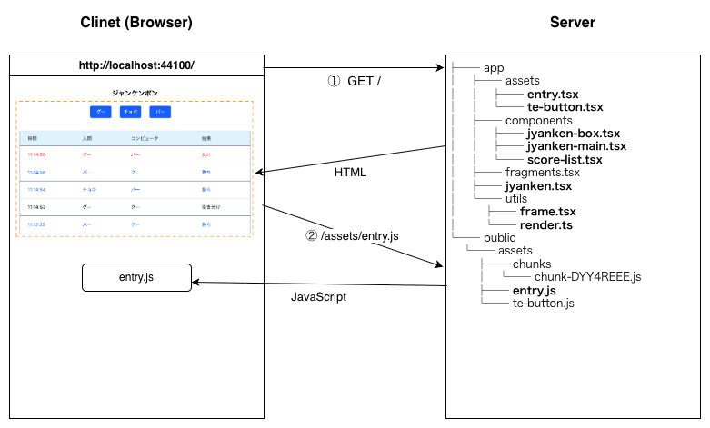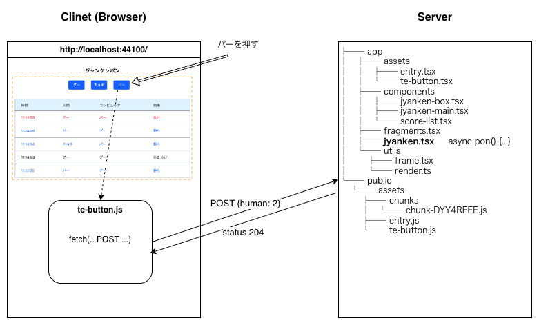 Remix3はサーバーサイドレンダリング(SSR)のフレームワークなので/へのGETリクエストがサーバーに届くと、サーバーサイドのapp/jyanken.tsxが動き(レンダリングされ)、ここから呼び出されるる複数のコンポーネントがレンダリングされてHTMLが生成されます。クライアントサイドで動作するte-button.tsxもいったんサーバーサイドでレンダリングされます、当然イベントハンドラー等のJavaScriptのコードは含まれません。