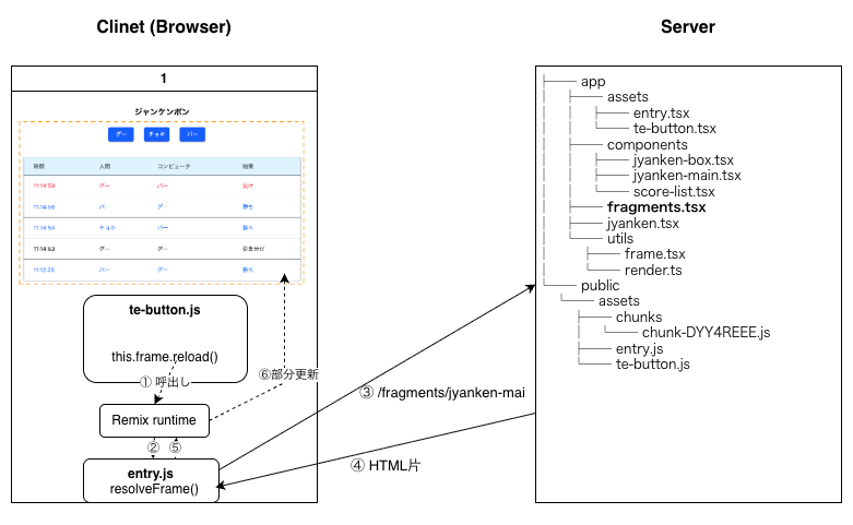 resolveFrameは、⑤のJSONデータをもとにサーバーサイドの /fragments/jyanken-mainにリクエストが送りapp/fragments.tsxが起動されます。