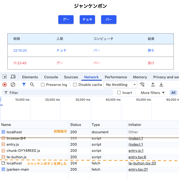 オレンジ色の点線の上は初期表示時のネットアクセスで、点線の下はジャンケンボタンを押した際のネットアクセスです。