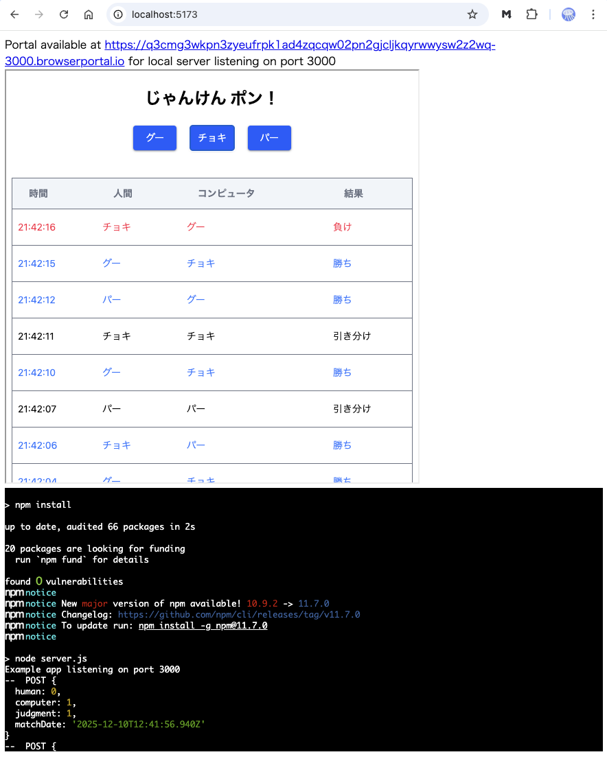 - ④ ジャンケンボタンを押したさいには、ジャンケン結果をバックエンドにfetchでPOSTします
